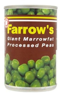 Farrow's Giant Marrowfat Processed Peas. Marrowfat processed peas is made with water, marrowfat peas and sugar & salt. It's Drained Weight = 180gFarrows have been producing Britain's finest giant Marrowfat peas since 1929. They're grown and packed with care to bring you the tastiest Marrowfats you can put on your plate. Fantastic with fish and chips, perfect with pies and you haven't had proper pea and ham soup until you've had it with Farrow's. Farrow's Giant Marrowfat processed peas is high in fiber, low in sugar and naturally low in fat making it a healthy option for you It is suitable for vegetariansStorageStore in a cool dry place. Once opened empty, cover and refrigerate. Use within 2 days. Buy Farrow's Giant Marrowfat Processed Peas 330 g x24 on Ovulent Green peas are very nutritious and allow you add variety to your diet. Green peas are an excellent source of protein and other nutrients. Beans can be cooked in a variety of ways depending on your diet and taste.