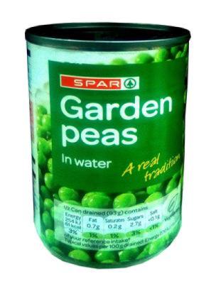 Spar Garden Peas In Water. It is Suitable for vegetarians. It contains: Garden Peas and Water. Spar Garden peas should be stored in a cool dry place. Once opened transfer unused contents into a nonmetallic container, cover and refrigerate. Consume within 2 days. Cooking InstructionsMicrowaveInstructions: 800W 2 mins / 900W 1_ minsEmpty contents into a nonmetallic bowl and cover. Heat on full power for 1 minute (800W/900W), stir then heat on full power for another 1 minute (800W)/30 seconds (900W)Stir and drain before serving. Saucepan Instructions: Empty contents into a saucepan. Heat gently for 2 3 minutes, stirring occasionally. Do not allow to boil. Drain before serving. Time: 2 3 minute. Buy Spar Garden Peas In Water 300 g on Ovulent Garden peas are very nutritious and allow you add variety to your diet. Garden peas are an excellent source of protein and other nutrients. Beans can be cooked in a variety of ways depending on your diet and taste.